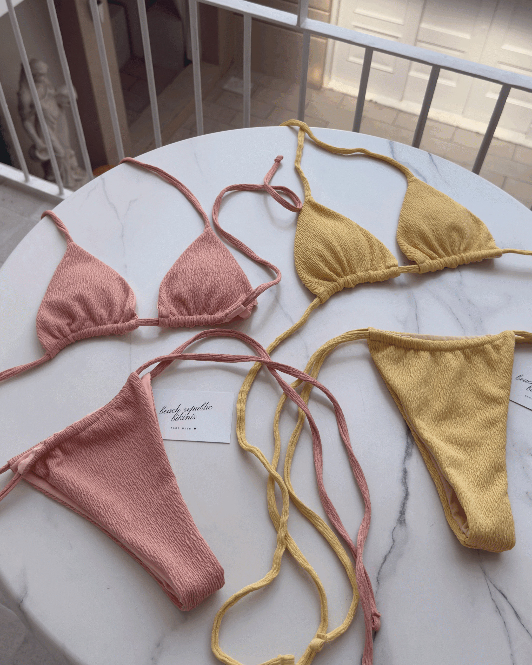 the classic crinkle triangle bikini available in colors butter yellow & milkshake pink, made with premium soft crinkle fabric double lined with softest fabric lining.