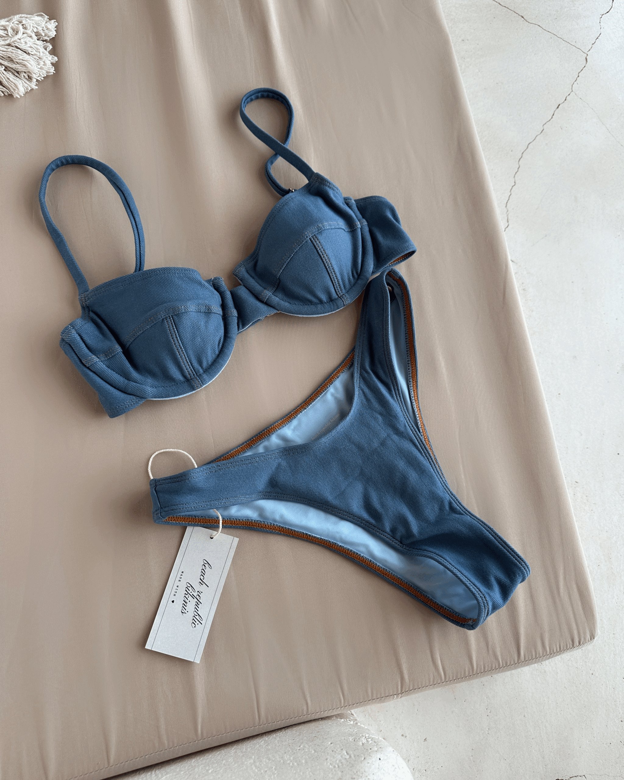 A swimwear classic, reimagined in denim. Meet the Miss Jean Set — our first-ever bikini crafted in premium brazilian stretch denim, designed to give the illusion of your favorite jeans but with the comfort of luxe swimwear. This piece features a sculpted underwire top for ultra support, adjustable shoulder straps, and a secure 3-hook clasp back for the perfect fit.