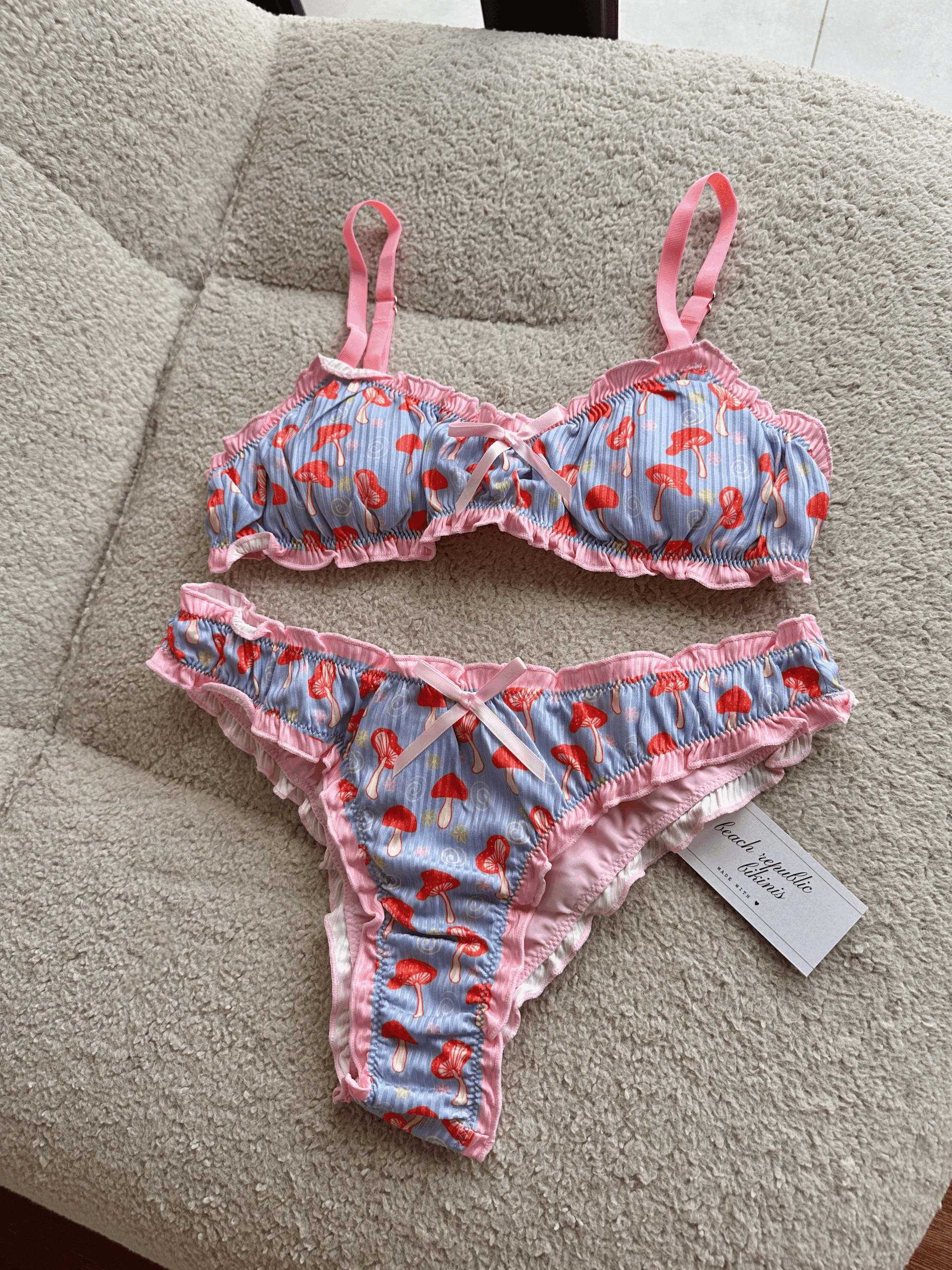 featuring our LUXE EDIT Collection – the sweetheart set in fun prints! mushrooms, mix of color purple & pink. a bandeau style top with removable pads, adjustable shoulder straps, bow & ruffle details.