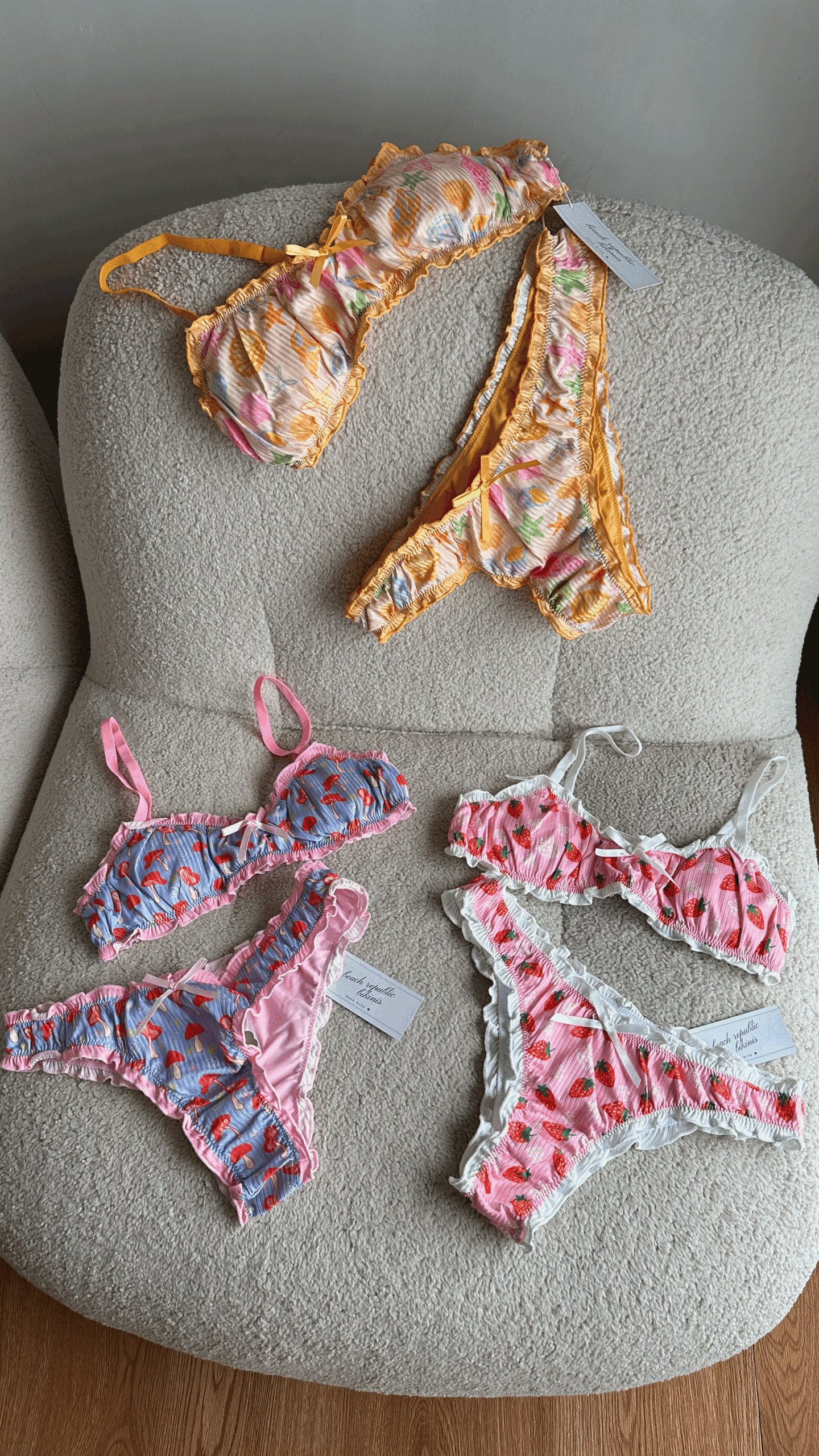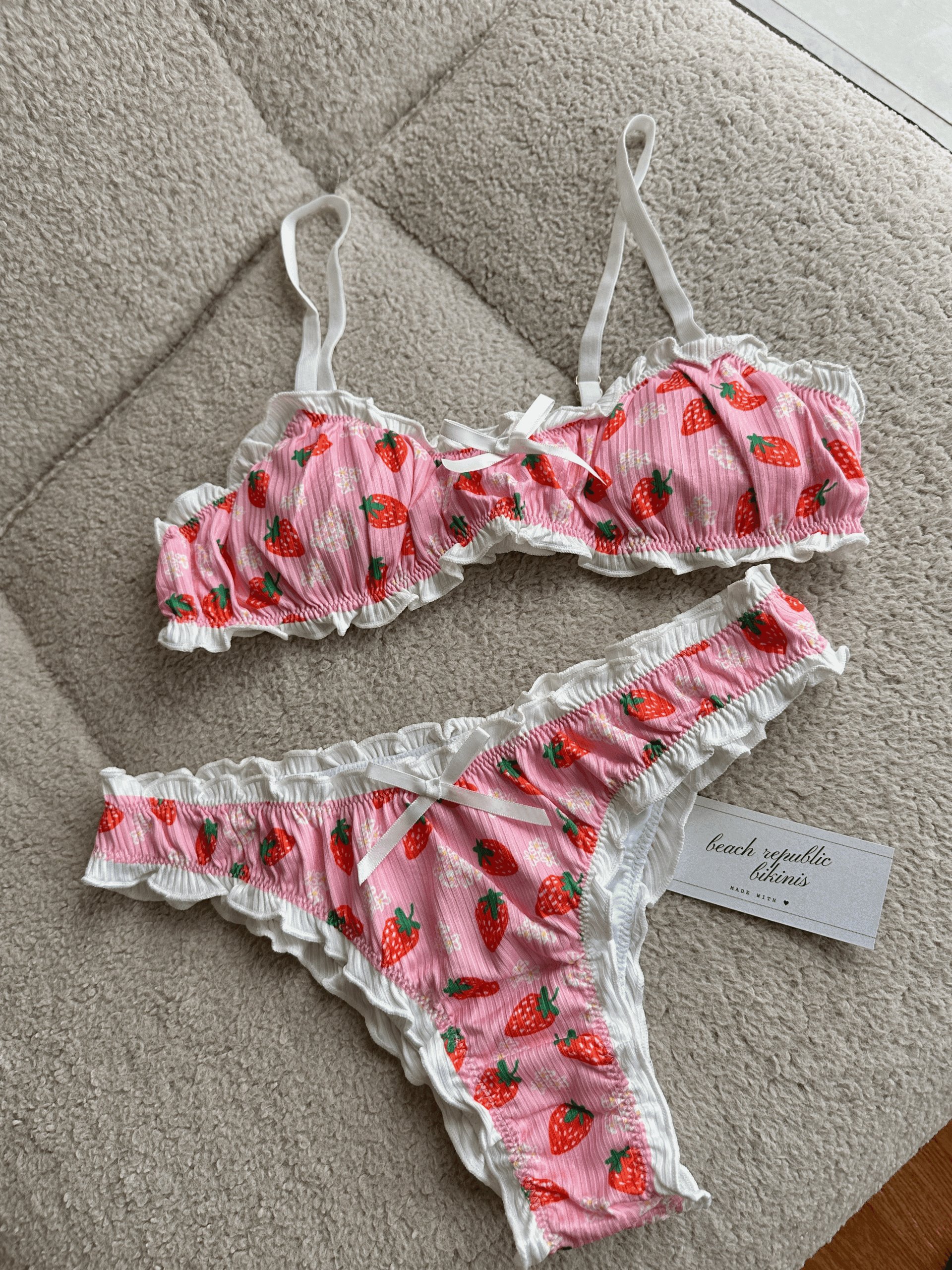 featuring our LUXE EDIT Collection – the sweetheart set in fun prints! strawberry shortcake, a bandeau style top with removable pads, adjustable shoulder straps, bow & ruffle details.