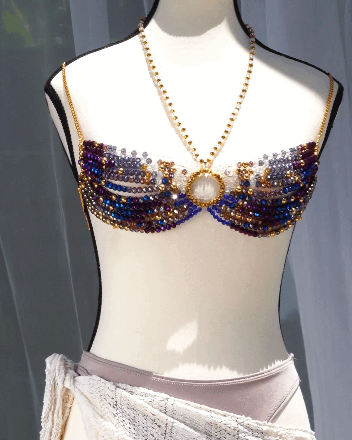 UNIVERSE bralette is screaming beauty & confidence! thoughtfully designed with mixture of metallic violet, royal blue, gold, alexandrite, amethyst, citrine, topaz & clear crystals. o-ring middle style with golden & clear crystals adjustable neck strap. its a perfect piece for your next event! bralette top only.